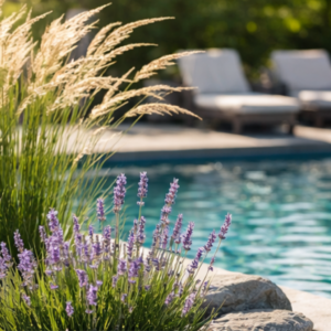 Planting around a pool should feel controlled, layered, and intentional. It’s not about filling space—it’s about shaping it. Ornamental grasses introduce movement and soften hard edges without overwhelming the layout, while a restrained touch of lavender adds fragrance, subtle contrast, and natural mosquito resistance. The palette should stay grounded in green, allowing texture and form to carry the design rather than relying on excessive color.